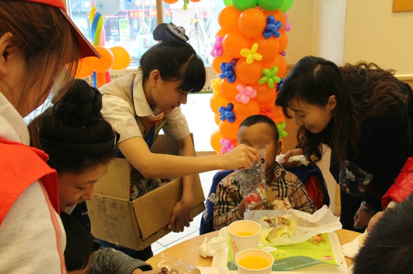 爱心传递志愿者在德克士快餐店照看孩子吃快餐。