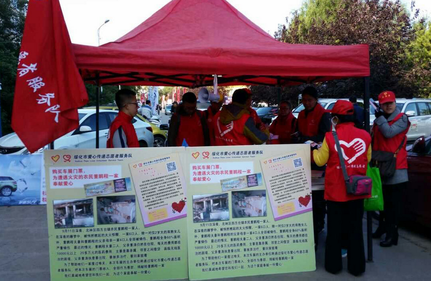 今年的国庆节期间,绥化市第八届秋季车展在新体育场举办。主办单位绥化报业集团和承办单位绥化报广文化传媒有限公司联合爱心传递志愿者服务队,要通过义卖门票的方式筹集善款,为北林区四方台镇遭受火灾的农民董鹏程一家献一份爱心。
