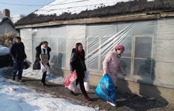 早上8点半集合出发,驱车80多公里,来到北林区四方台镇乡下的几个学生家,了解孩子们一年来的家庭情况、学生本人的学习情况。在春节即将到来之际,为每个孩子家庭送去了价值230元钱的冻鱼、豆油等年货以及每人200元现金。