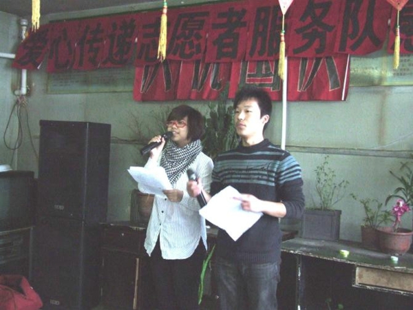 两位年轻的主持人首先祝福老年公寓的爷爷年年们新年快乐、健康长寿。随后,节目便一一开始演出!