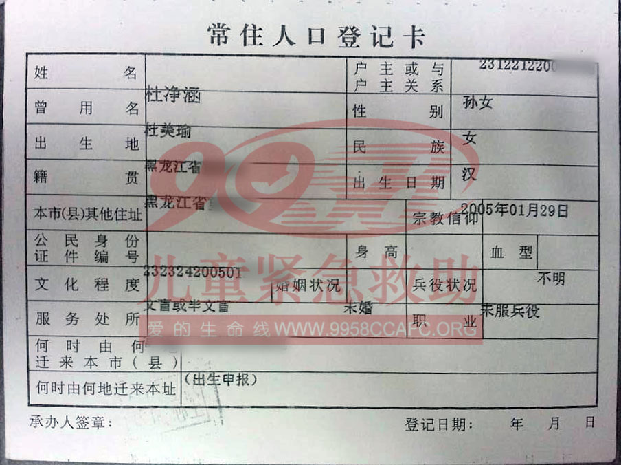 杜净涵,女,出生于2005年1月29日,家在黑龙江,患骨肉瘤。