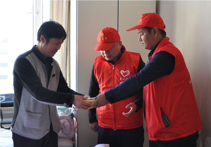 10月4日下午,志愿者服务队代表把1877.9元义卖门票收入,全部捐赠给已经在绥化市第一医院烧伤科住院将近一个月的董鹏程家人的手中。