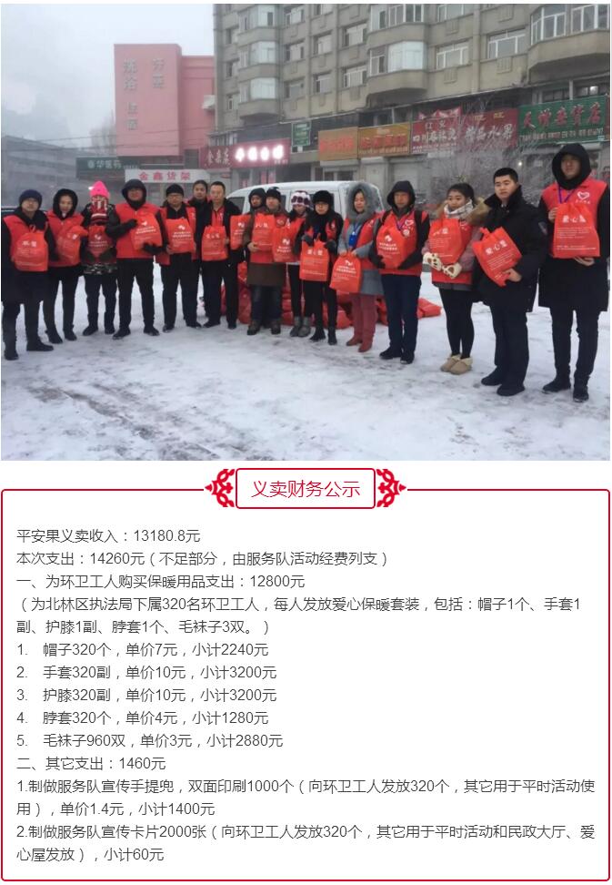 十年初心,不辜重托。2018年01月18日,绥化市爱心传递志愿者服务队志愿者用迎新年苹果义卖活动所筹集的善款,在绥化市北林区圈树,为北林区执法局320名环卫工人购买并发放了320套保暖套装(包括一顶棉帽、一个脖套、一副手套、一副护膝、三双保暖袜)感谢社会爱心人士和爱心企业对弱势群体的关爱和对公益事业的支持和援助,温暖这个寒冬…