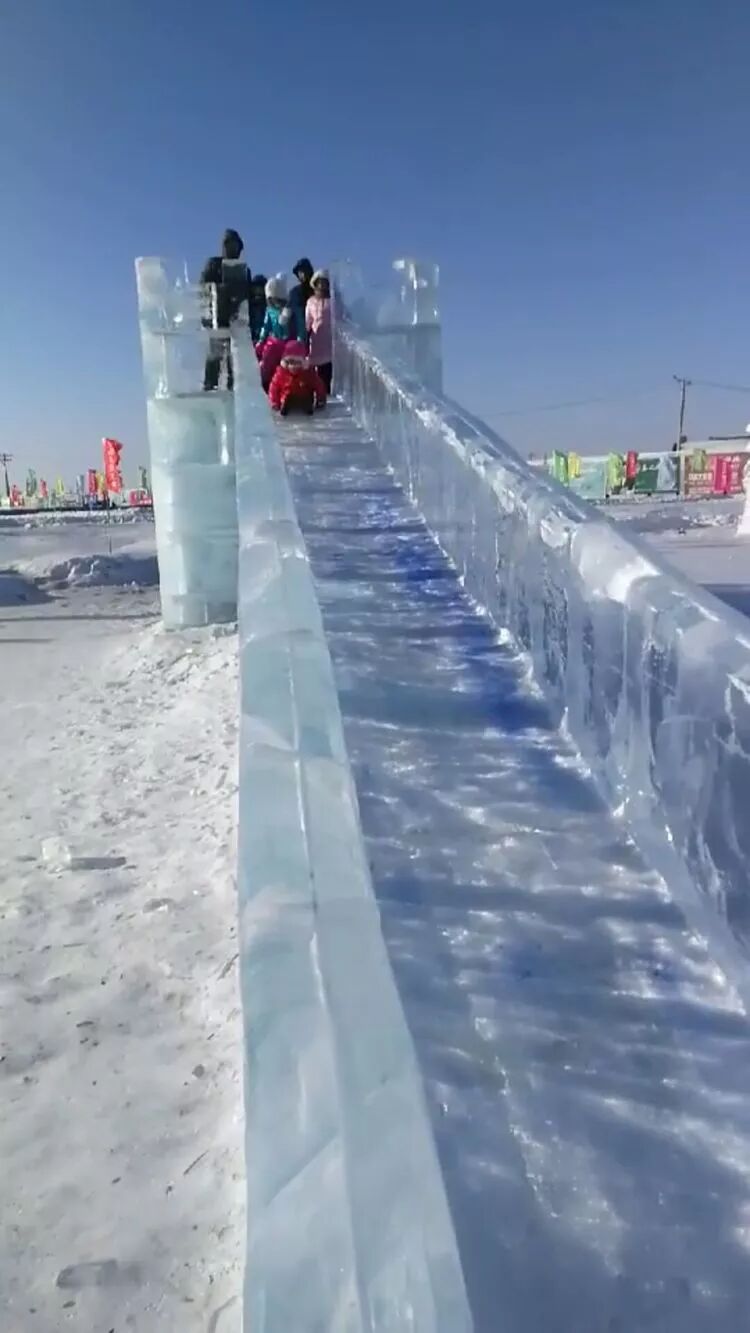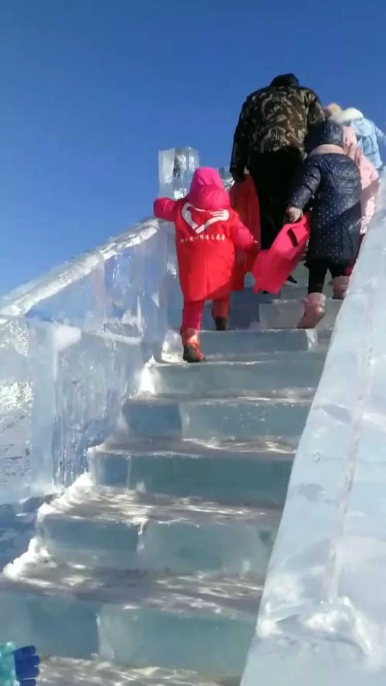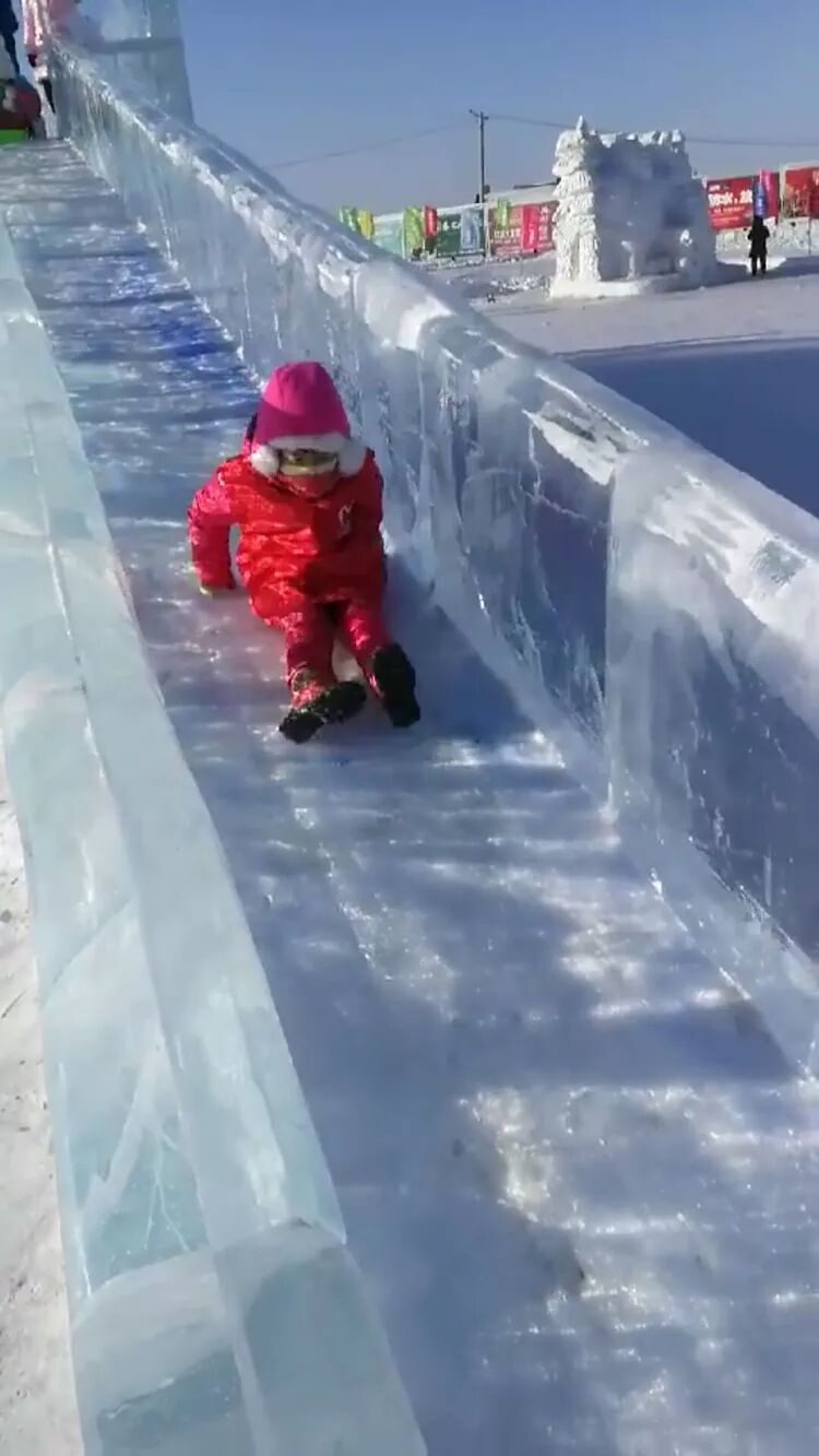 志愿者小朋友们在体验冰滑梯,晶莹剔透的冰滑梯真漂亮!