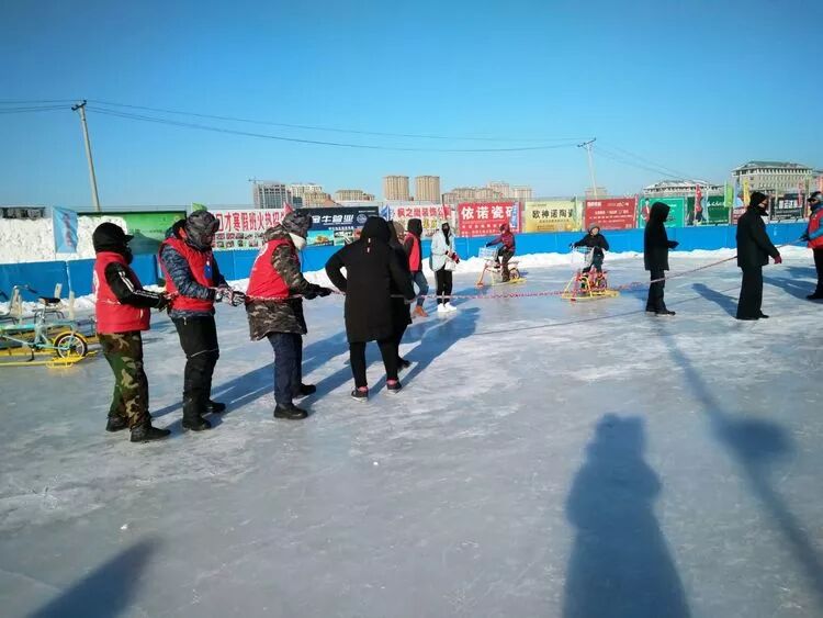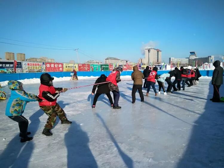 左拉右拽,脚下光溜溜,冰上拔河欢乐多。